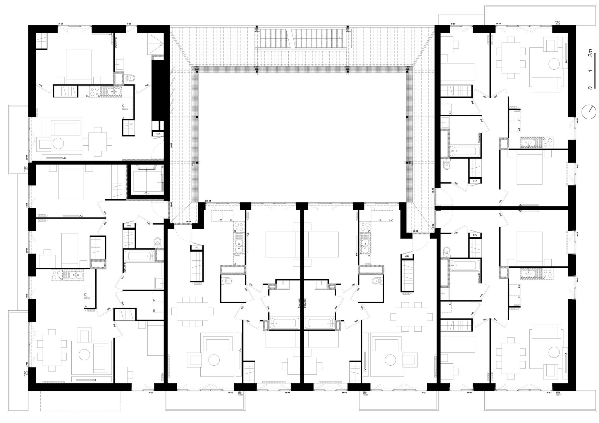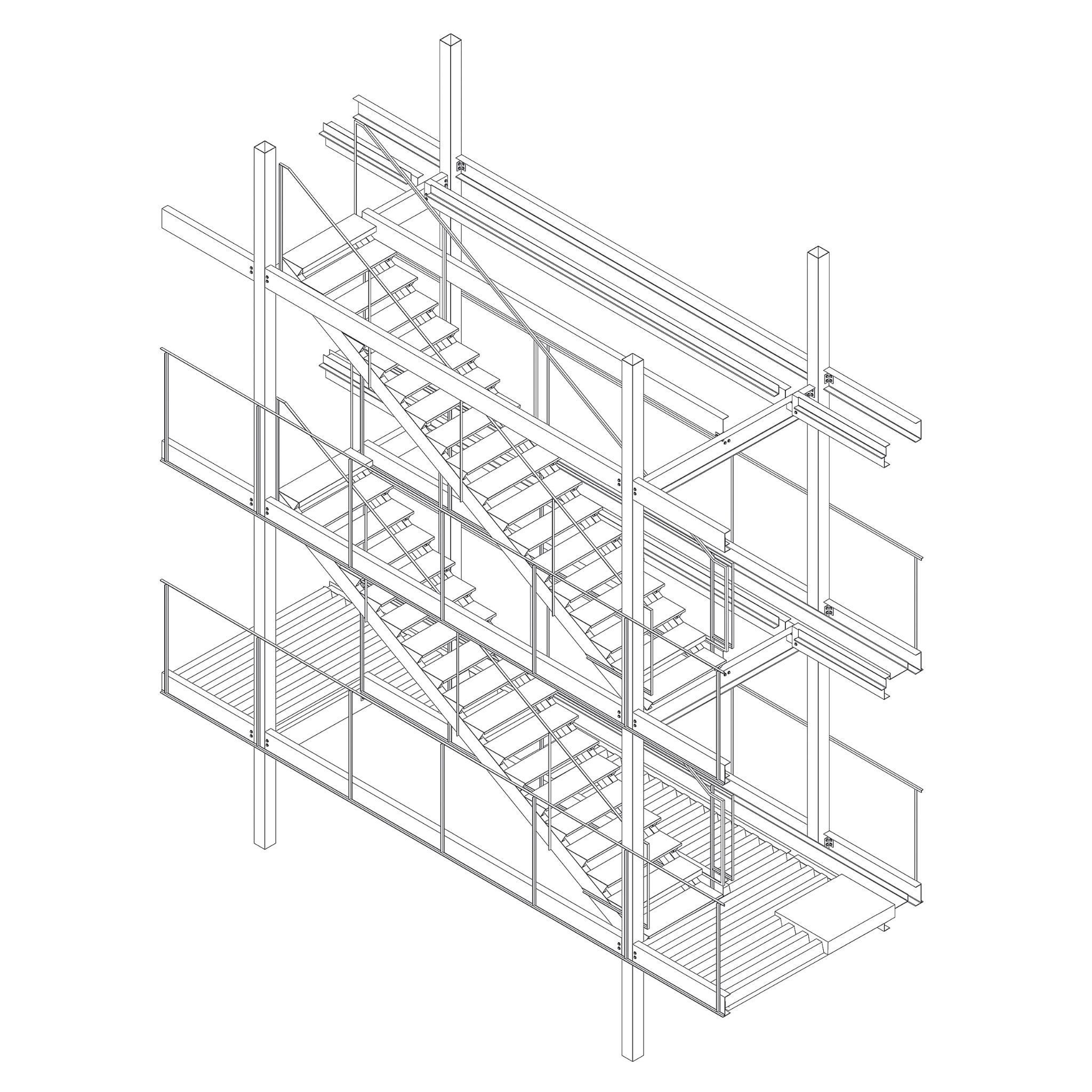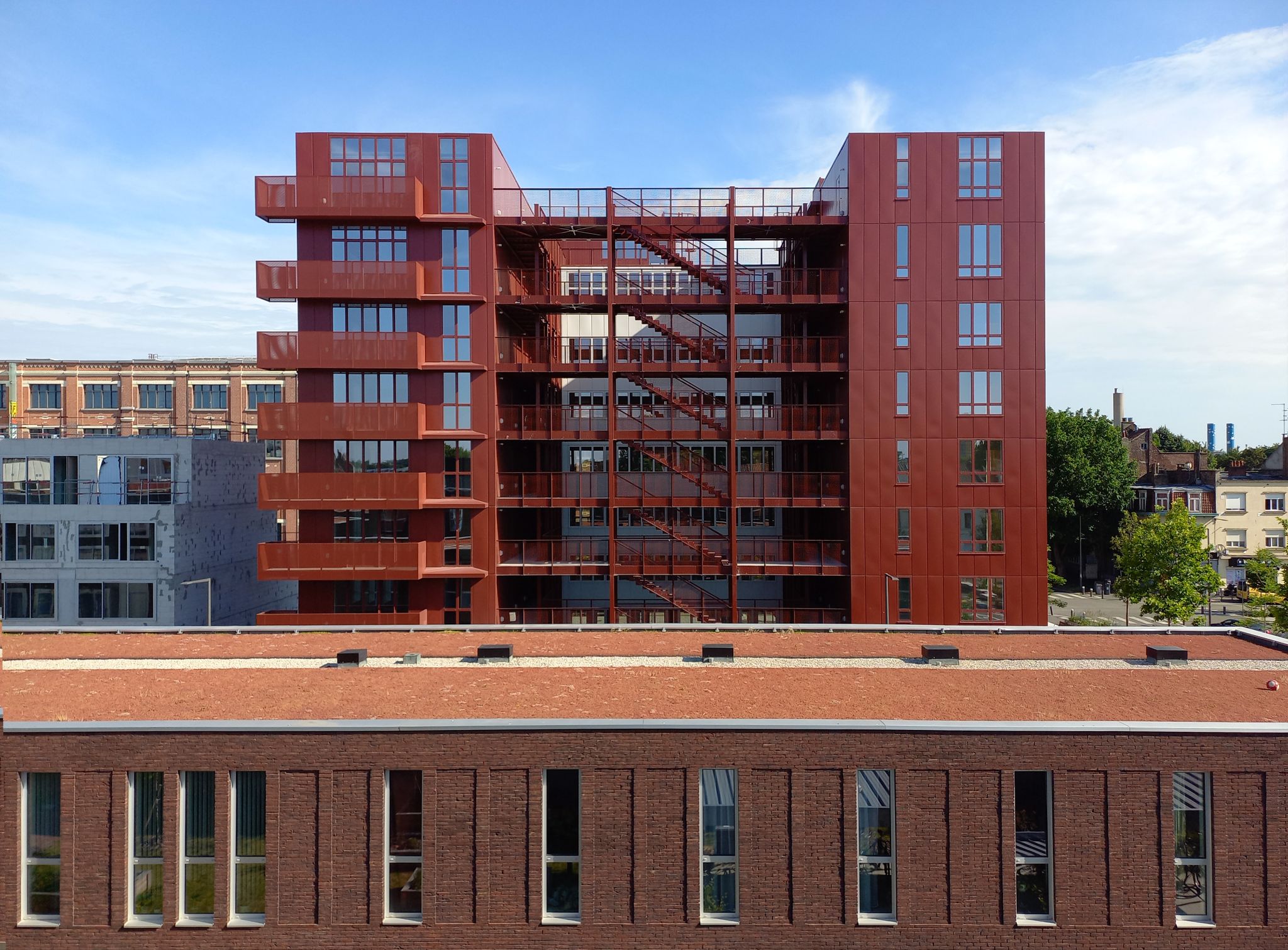 Le projet répond aux exigences précises fixées par la ville de Lille, la ZAC Fives Cail et la maîtrise d’ouvrage : un ascenseur unique pour 41 logements, du T2 au T4, tous à double orientation, sans dépasser sept niveaux au-dessus du rez-de-chaussée. De cette équation rigoureuse découle l’expression architecturale de l’immeuble : une distribution par coursives, escaliers et passerelles métalliques extérieurs, distancés des façades vitrées et enveloppant un vaste atrium.
