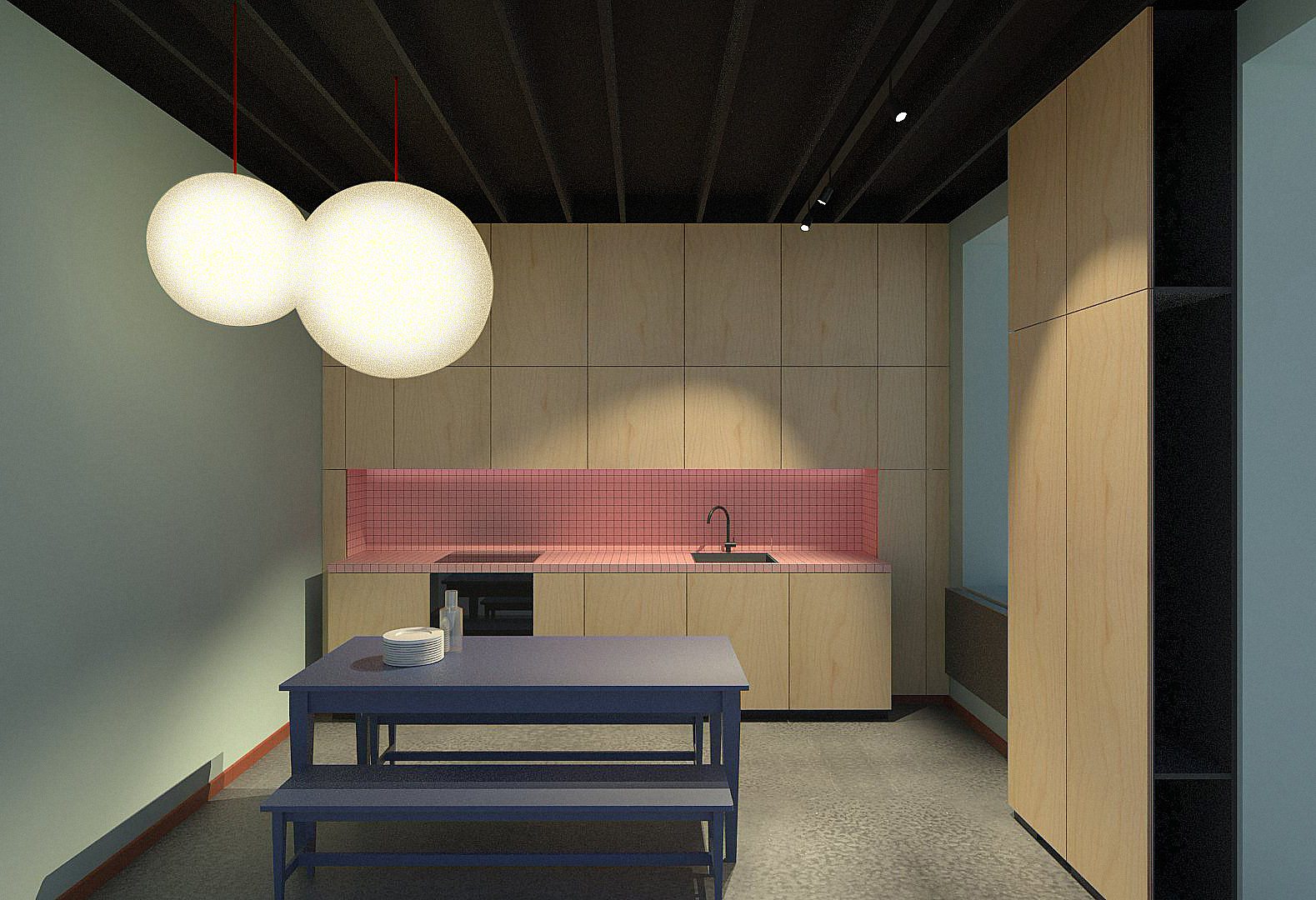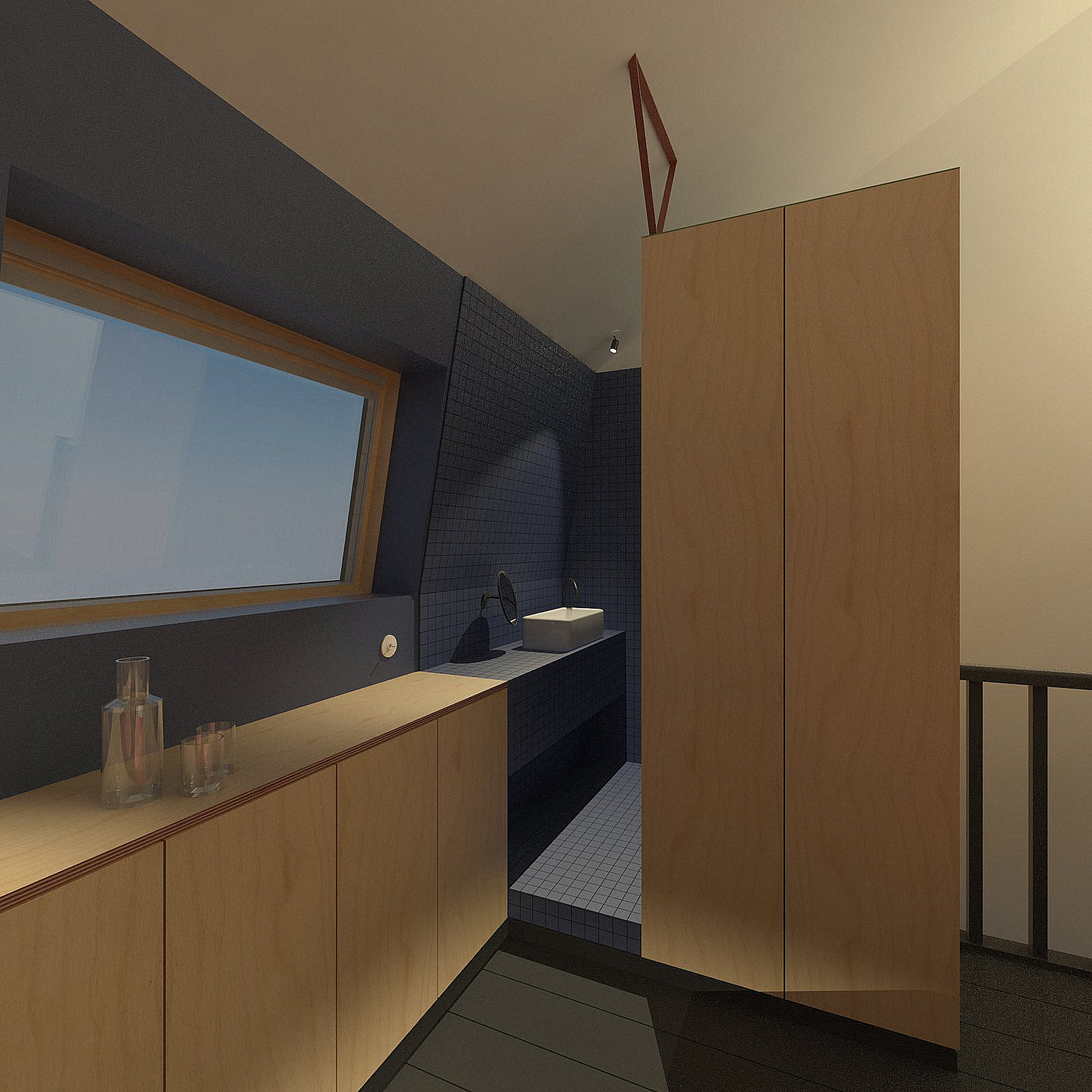 L’attention se concentre sur les espaces « servants » — cuisine, cabinet d’aisance, salle d’eau — qui deviennent de véritables objets architecturaux. Placés au premier plan, dissimulés ou installés dans l’entre-deux, ils se distinguent par un habillage de contreplaqué bouleau et de carrelage en grès cérame 5×5, affirmant leur présence autant qu’ils structurent l’habitat.Â